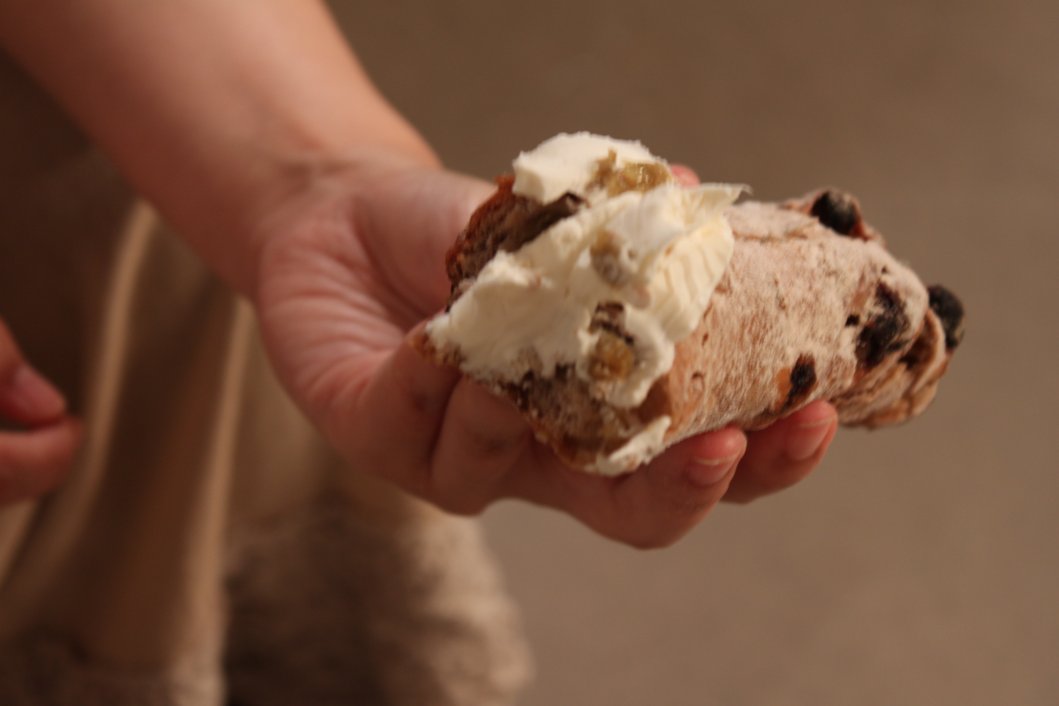 くるみとハーブ、グリーンレーズンがギッシリでした。ゴルゴンゾーラチーズとクリームチーズをつけてムシャムシャ仕事終わりに頂きました。とてもボリュームがあってお腹一杯になりました。このほかに頂いたパンもとっても美味しかったです。いつも本当に有り難うございます。